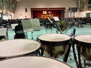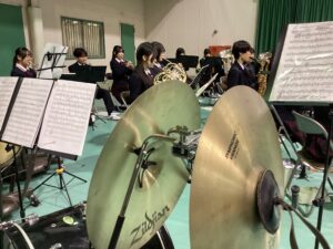 写真の大きな太鼓はティンパニ(4つあるのですが、部員たちがみんなで部室から体育館まで頑張って運んでいました。力仕事もがんばる吹奏楽部です。)
