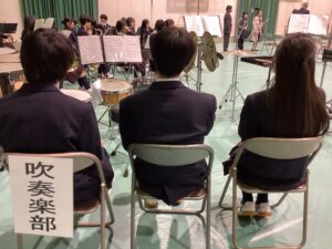 3年生のみなさん、ご卒業おめでとうございます。吹奏楽部は演奏でお祝いです。アルセナール(入場曲)、国歌、式典終曲(退場曲)の3曲を演奏しました。参列された数組の保護者の方から、わざわざ「ありがとう」とお声がけいただき(3年生部員の保護者さまではないそうです)、部員たちはなんとも嬉しそうな顔をしていました。よかったね。