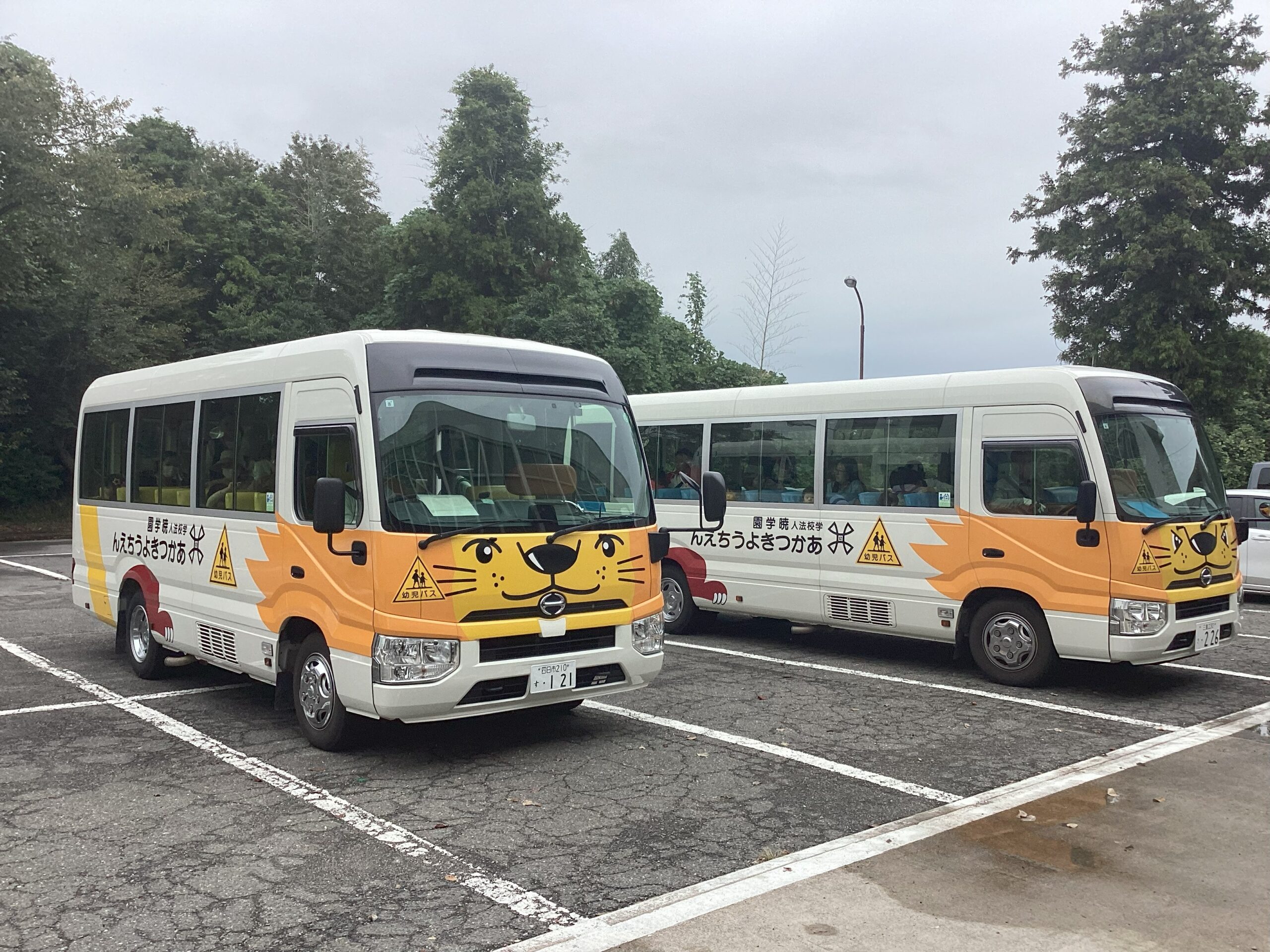 ライオンバス2台から暁幼稚園の園児が元気よく降りてきました。
