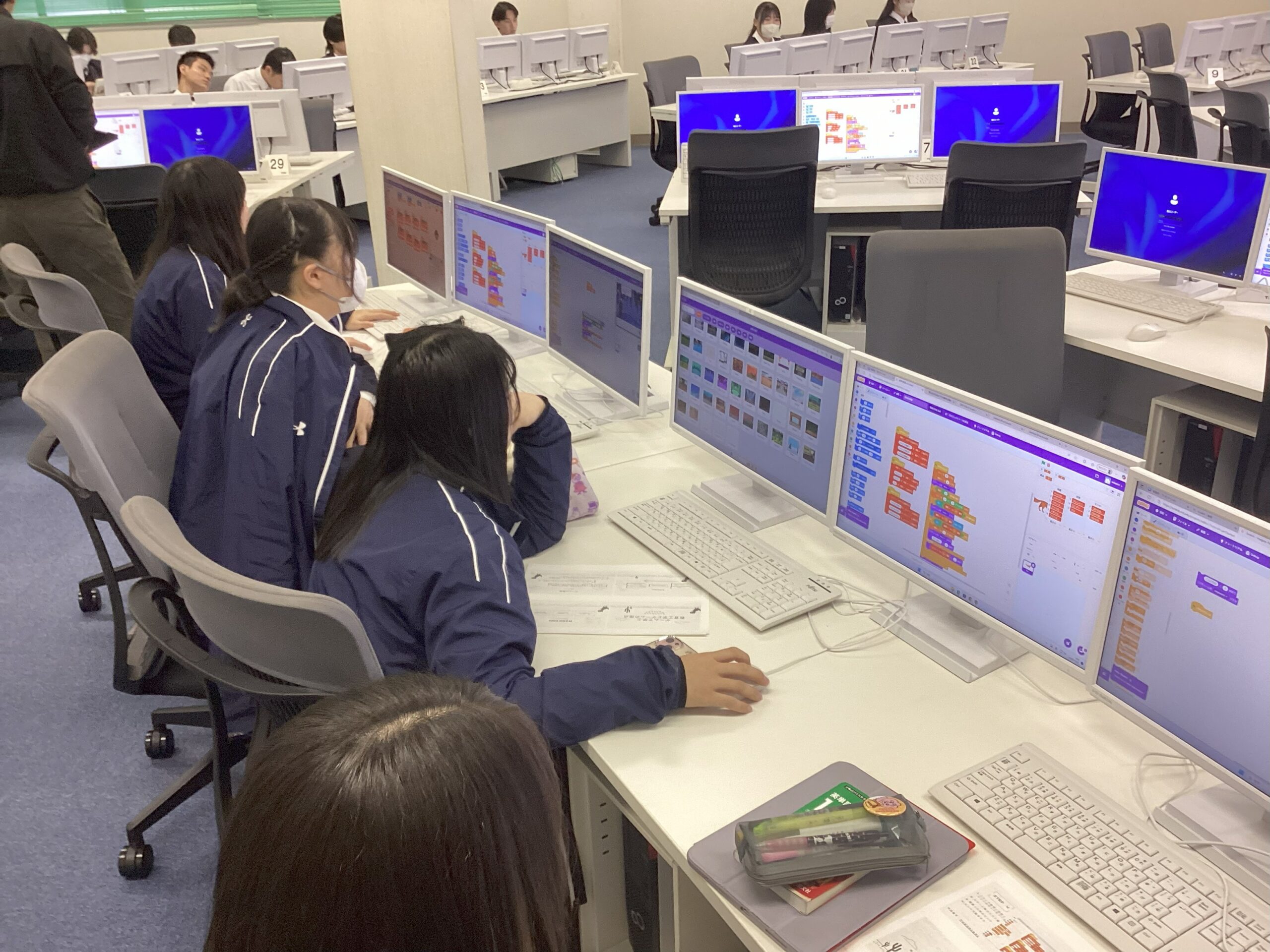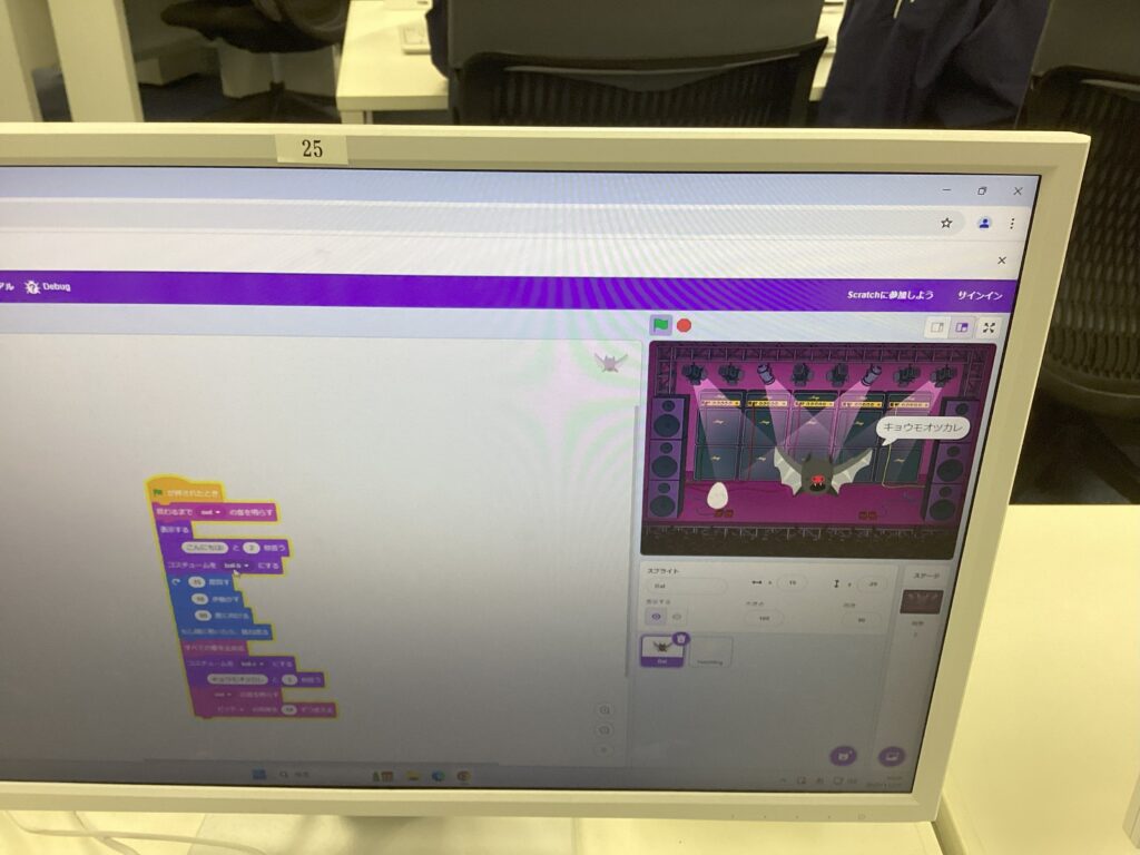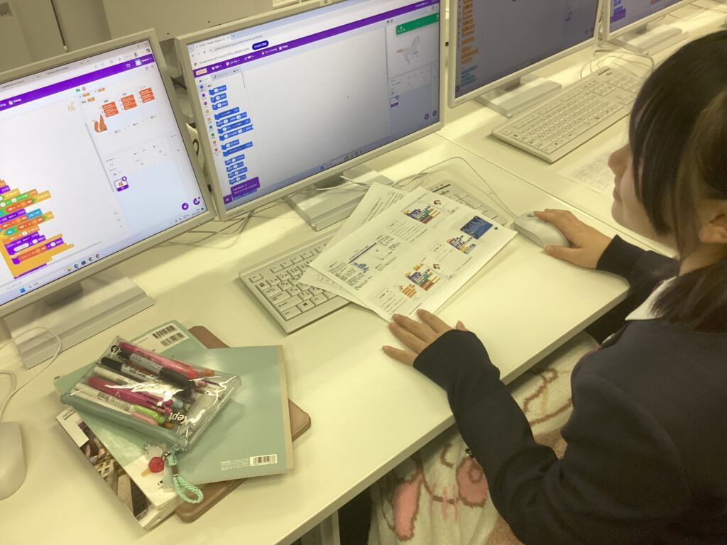 生徒はスクラッチを使いゲームを作成し、友達と一緒にキャラクターを動かしたりしました。ゲームの要素について学ぶことができたかな。来校いただいた関係者の皆様、貴重な体験ありがとうございました。