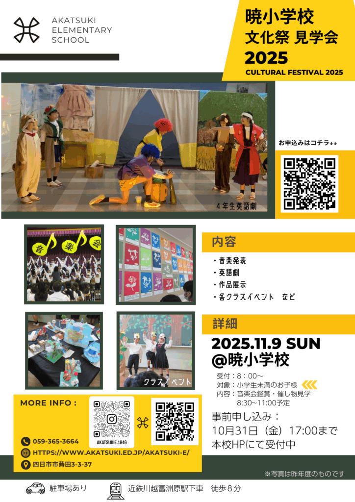 11月9日(日)実施の、暁小学校 文化祭の見学についてご案内いたします。